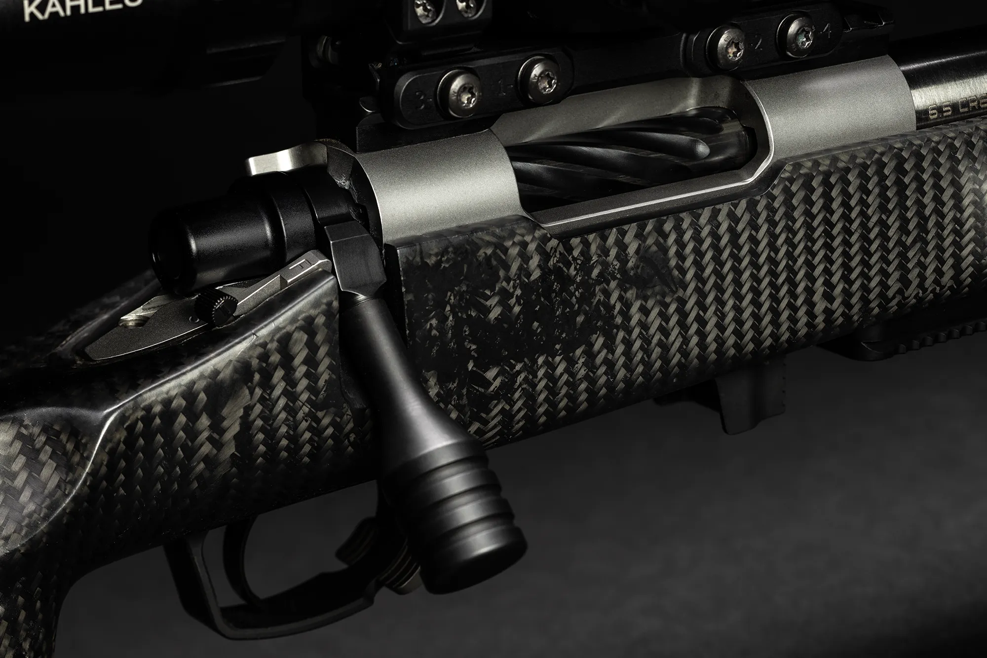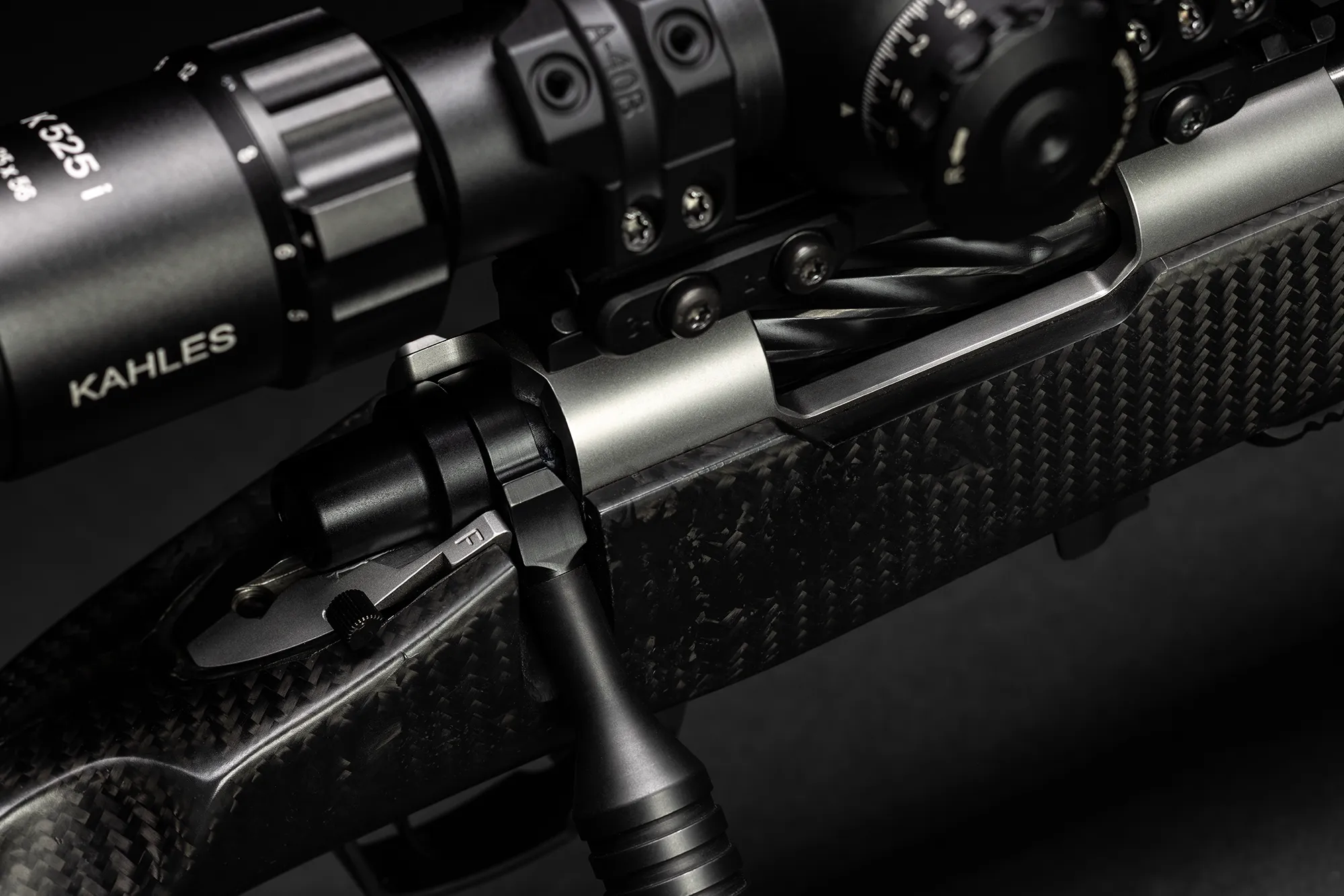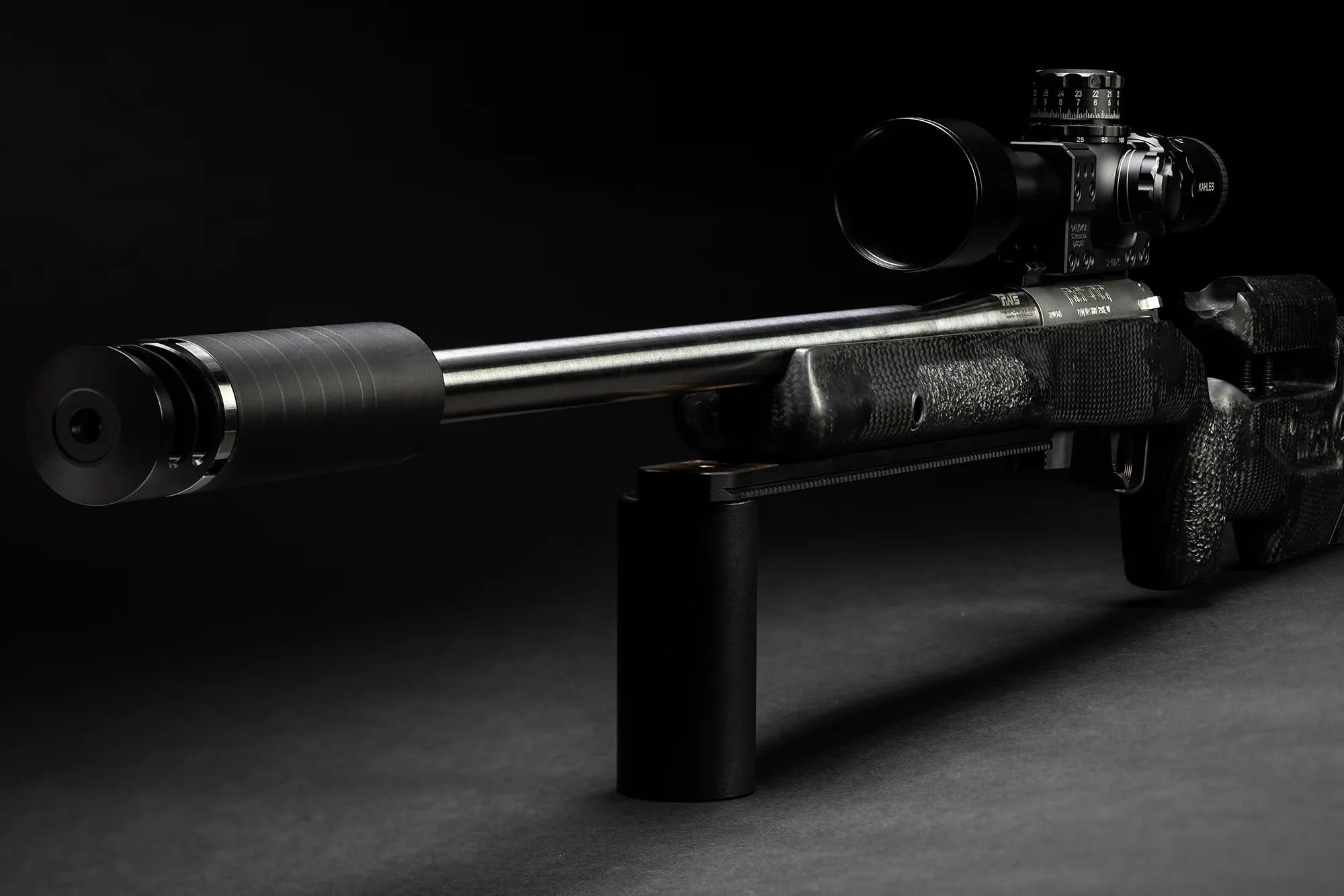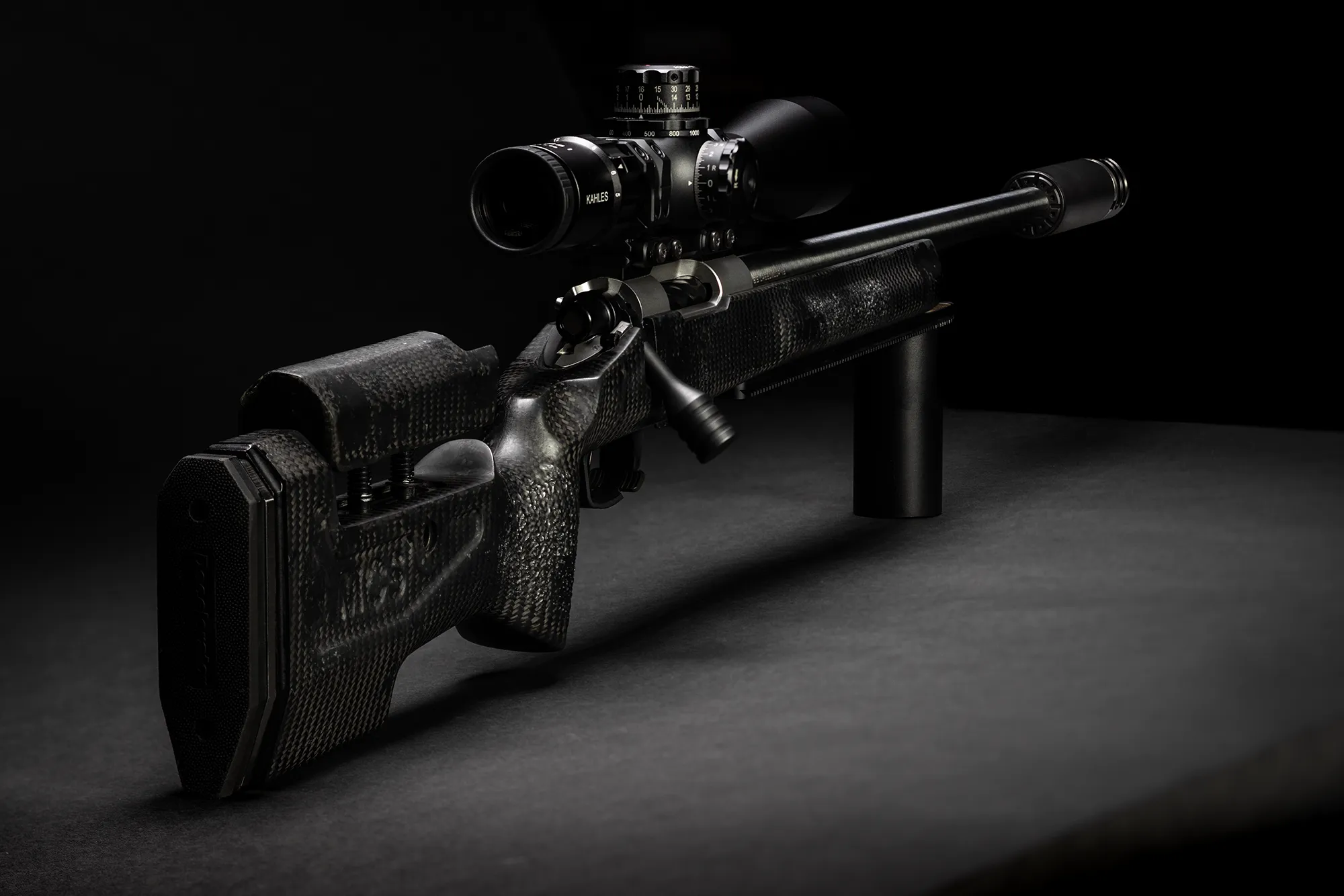 We call this a “hybrid” rifle because blurs the line between a hunting and competition rifle. This rifle features a full-length ARCA rail with adjustable weights as well as in-house custom rear length of pull spacers from 3D printed plastic or laser cut stainless steel. This system allows for up to 2.5 lbs of additional weight to be added as well as providing length of pull and weight bias adjustment for a true “do it all” rifle. This rifle is available for customer demo to experience the performance that a true custom build delivers.
