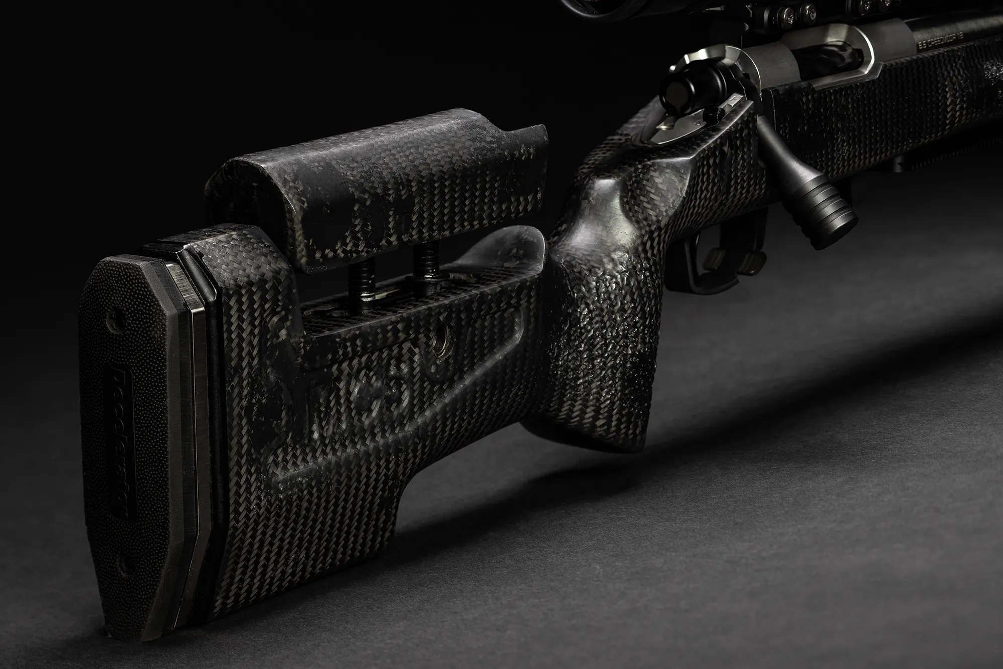 Manners T4A-Team stock, adjustable cheek and LOP, elite carbon fiber, back in black camo, epoxy bedded